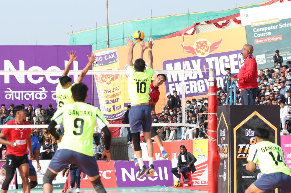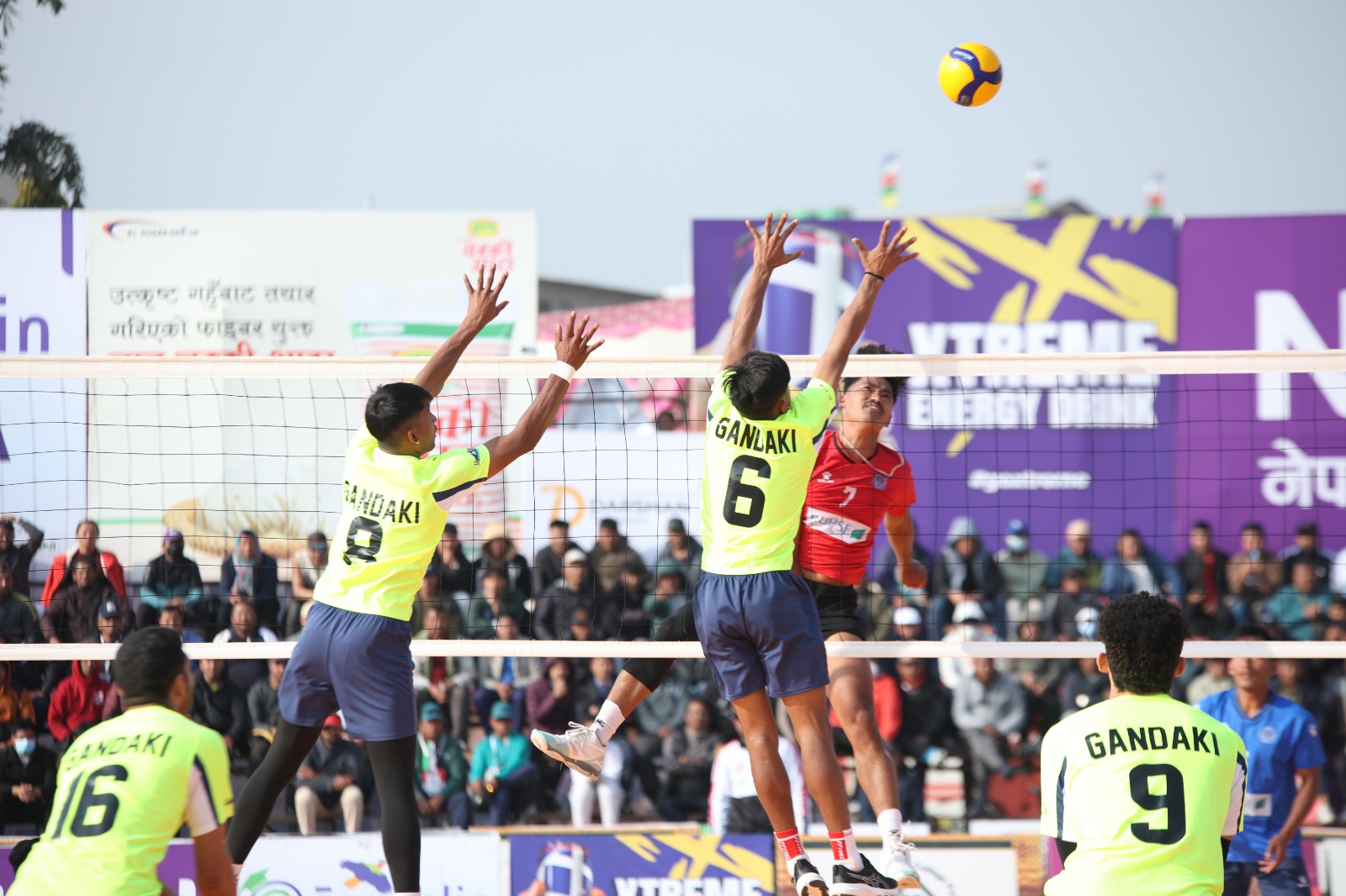 पोखरा रंगशालास्थित भलिबल कोर्टमा जारी च्याम्पियनसिपअन्तर्गत आजको चौथो तथा अन्तिम खेलमा पुरुषतर्फ गण्डकीले पुलिसलाई ३–० को सोझो सेटमा पराजित गरेको हो । गण्डकीले पहिलो सेट २५–२२, दोस्रो सेट २५–२० र तेस्रो सेट २५–१४ ले आफ्नो पक्षमा पा¥यो । यसअघि आजै भएको खेलमा पुरुषतर्फ पर्वत जिल्ला भलिबल संघले माल्दिभ्स भलिबल एसोसियसनलाई ३–० को सोझो सेटले पराजित गरेको थियो । पर्वतले पहिलो सेट २५–१७, दोस्रो सेट २५–१८ र तेस्रो सेट २५–१६ ले जित निकालेको थियो ।