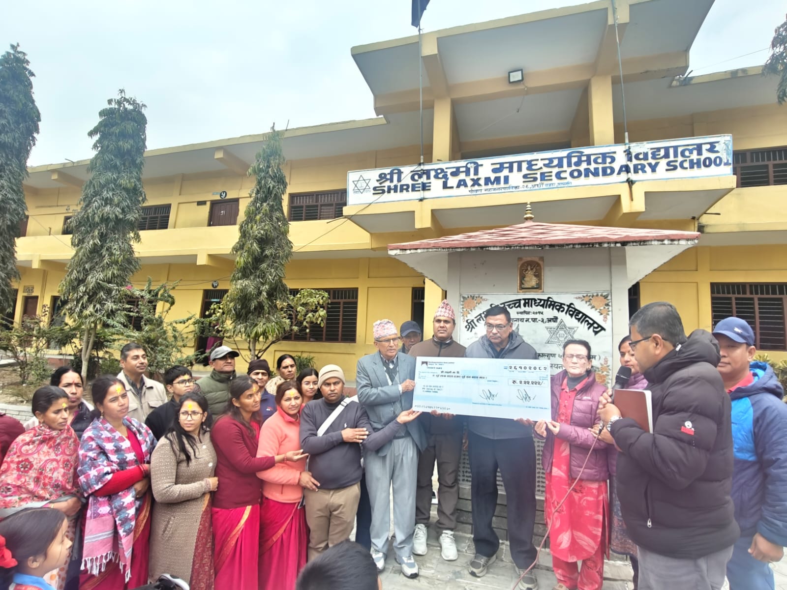 शिक्षक अभिभावक सङ्घका अध्यक्ष मधुरा कुमार श्रेष्ठ र विद्यालय व्यवस्थापन समितिका सदस्यहरु, विद्यालयका शिक्षक शिक्षिकाहरू र विद्यार्थीहरू बीच सोमबार एक कार्यक्रम गरी स्वर्गीय दुर्गादेवी पौडेलका श्रीमान विष्णुप्रसाद पौडेलले छोरा विजयेन्द्र पौडेल, बुहारी पुष्पाञ्जली बराल,छोरीहरू इन्दु अधिकारी, तिर्सना पौडेल र सुस्मिता पौडेल लगायत परिवारसहित चेक रकम हस्तान्तरण गर्नुभएको थियो। स्वर्गीय दुर्गादेवी पौडेल तथा उहाँको परिवारबाट सो विद्यालयको भौतिक तथा शैक्षिक उन्नतिका लागि विभिन्न समयमा सहयोग रहँदै आएको थियो । त्यसैगरी सोमबार नै परिवारको तर्फबाट पोखरा महानगरपालिका वडा नम्बर २७ साहेलापाखामा रहेको श्रीकृष्ण प्रणामी मन्दिर वृद्ध तथा बाल आश्रम सेवा समितिमा समेत खाद्यान्न सामग्रीहरू हस्तान्तरण गरिएको थियो ।